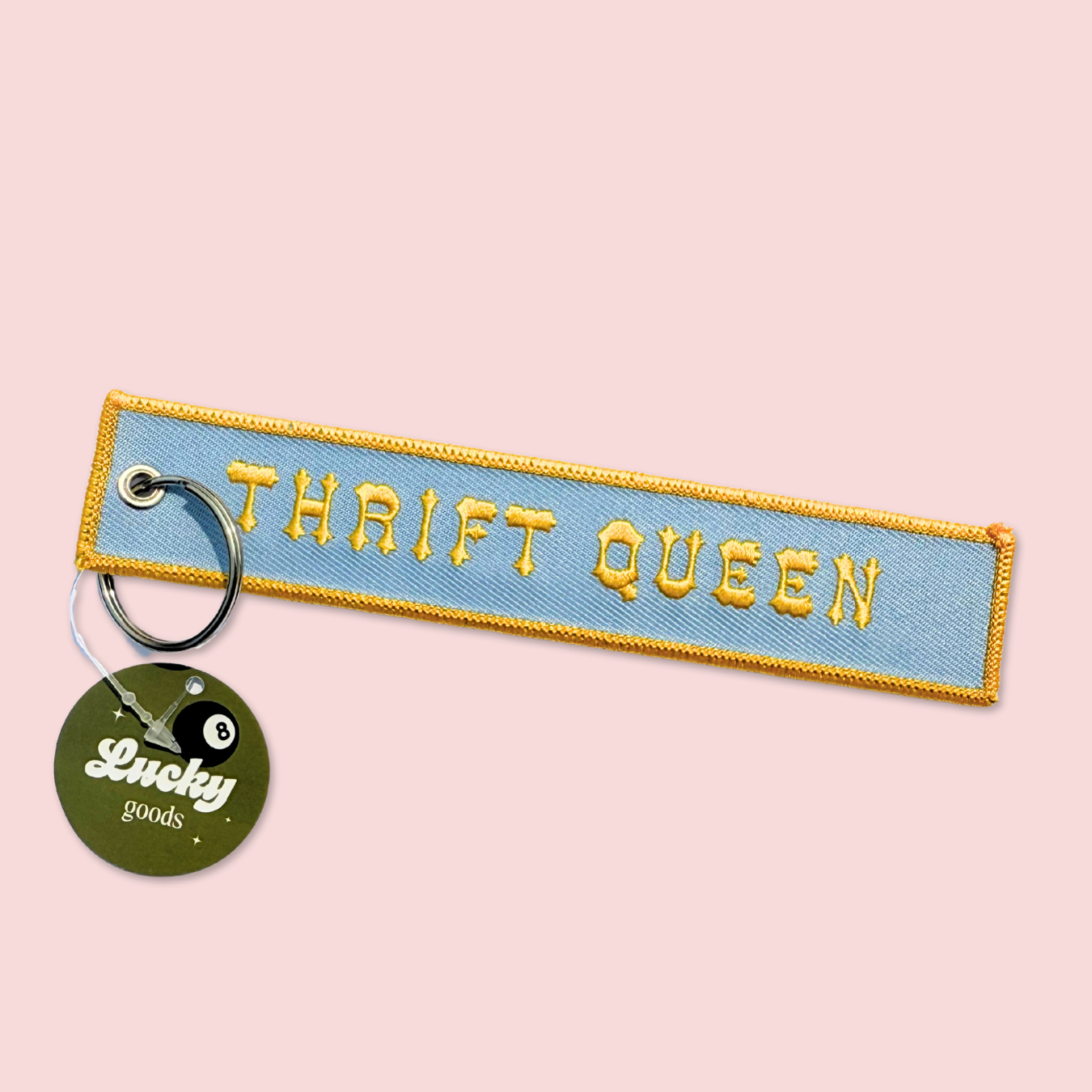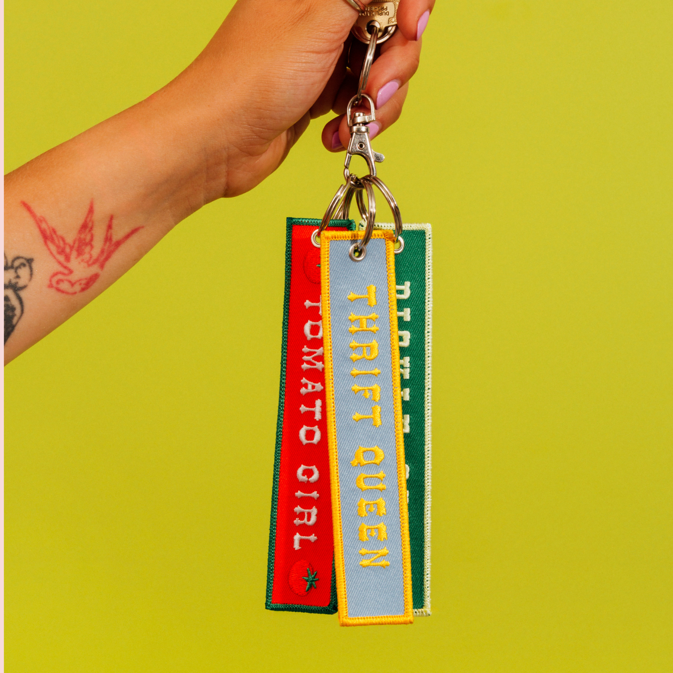 A bold little tag for emotional support keys, bags, or backpacks. Made from sturdy woven nylon with crisp embroidered lettering, this piece is equal parts dramatic and durable.